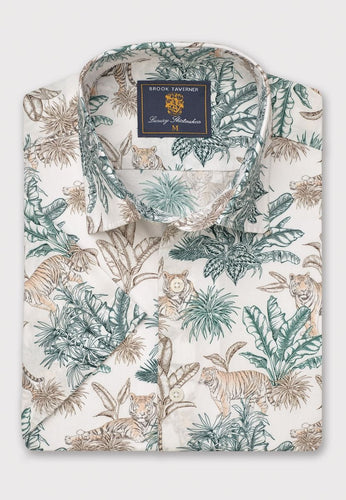 Regular Fit Khaki Tiger Tropical Print Short Sleeve Shirt (4589A)