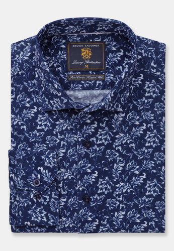 Navy Floral Print Velvet Touch Needle Cord Shirt (4263BT)