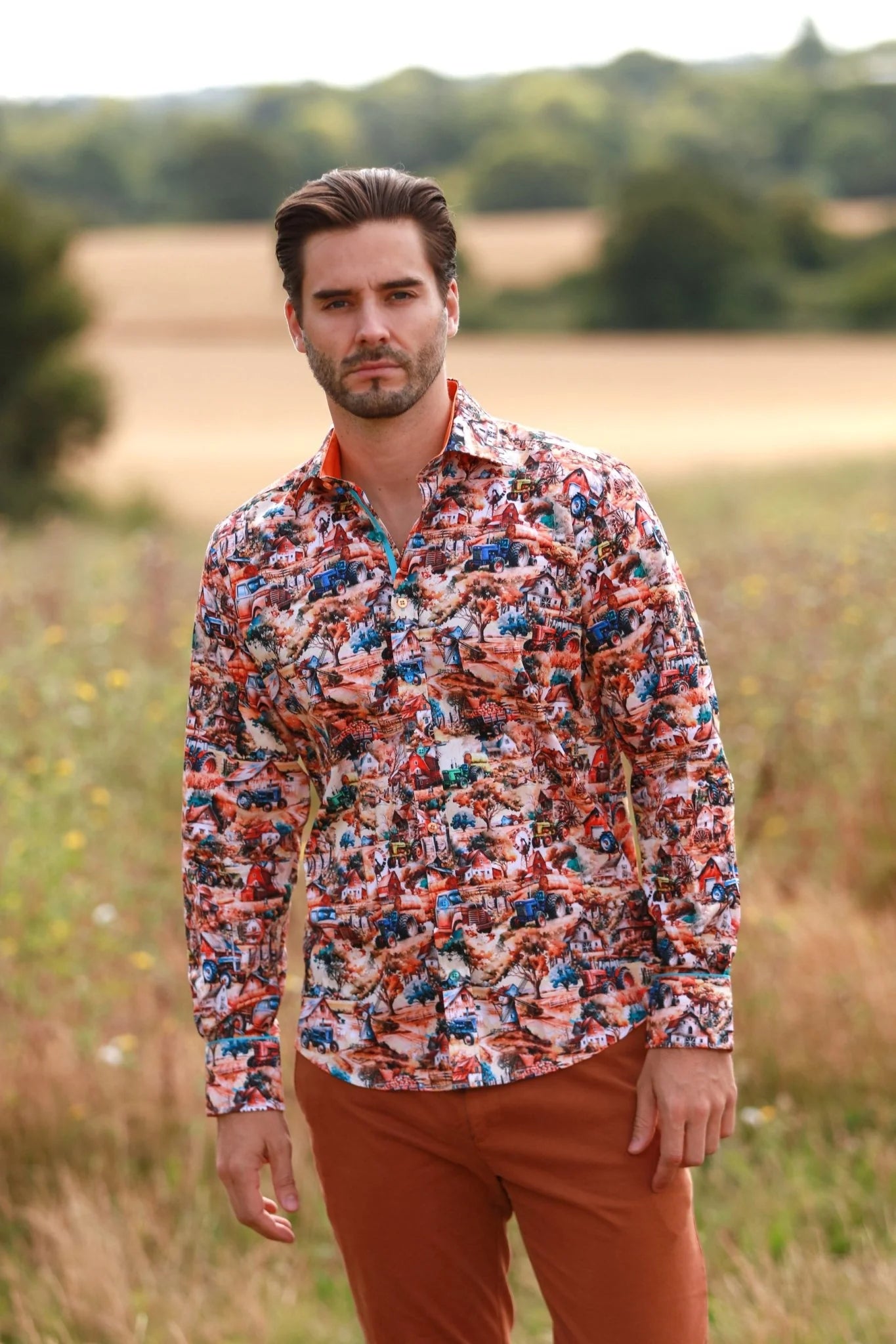 Step into rustic charm with this Farm and Tractor Print Shirt. This shirt features a vivid countryside scene complete with detailed depictions of farmhouses, tractors, and rural landscapes. The vibrant colors and intricate design bring a touch of rural life into your wardrobe, making it perfect for casual outings or themed events. The shirt is tailored for comfort with a relaxed fit, allowing you to move freely while showcasing your love for the countryside. Pair it with earthy tones to complete the look.